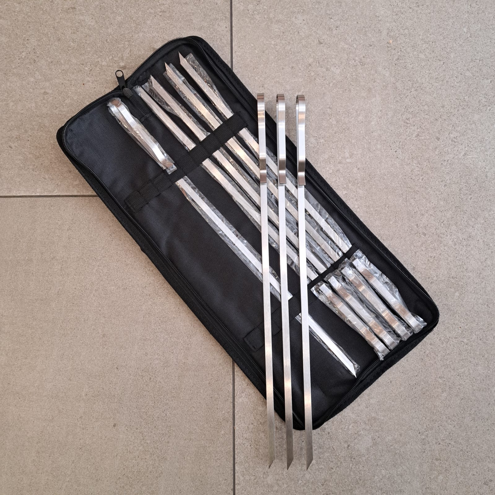 Los fierros para anticuchos sirven para ensartar ingredientes como carne, verduras y embutidos para asarlos. Su función principal es mantener unidos los trozos de comida de manera uniforme, permitiendo una cocción pareja y fácil de girar en la parrilla, y facilitando su manipulación y servicio. 8 unid.