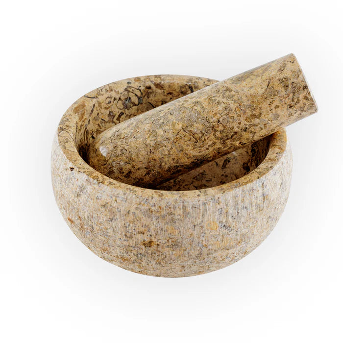 Set compuesto por un mortero de mármol, color coral y mano de mortero, pulidos. Herramienta para la molienda de hierbas y especias, y preparación de salsas. Ideal para la molienda de productos secos y húmedos, como ajo, pimienta, jengibre, nueces, hierbas y cualquier especia. Utilizable también para la preparación de guacamole, pesto, pebres, salsas caseras..